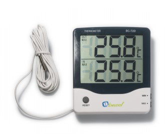Электронный термометр BC-T2D предназначен для измерение температуры воздуха внутри и снаружи помещения. Электронный термометр BC-T2D выполнен в виде моноблока имеющего выносной температурный датчик на проводе длиной 3000 мм. На большом жидкокристаллическом дисплее одновременно отображаются показания температуры снимаемой с датчика на корпусе и показания температуры, снимаемые с выносного датчика. Электронный термометр BC-T2D имеет высококонтрастный дисплей, кнопку сброса памяти, отображает минимальную и максимальную достигнутые температуры, может устанавливаться на горизонтальных поверхностях и имеет отверстие для подвеса на вертикальные поверхности.
