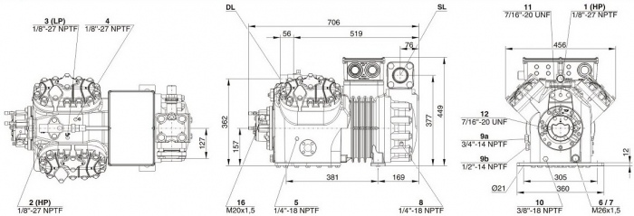 В зависимости от необходимых условий работы можно купить поршневой компрессор Bitzer с дополнительными опциями: подогрев масла в картере, вентилятор дополнительного охлаждения цилиндров, система охлаждения впрыска, система регулировки производительности. В комплект стандартной поставки, входит заправка маслом и защитным газом. Модель оборудована защитными вентилями Rotalock на всасывании и нагнетании. В стандартном исполнении, компрессор имеет 4 виброопоры.